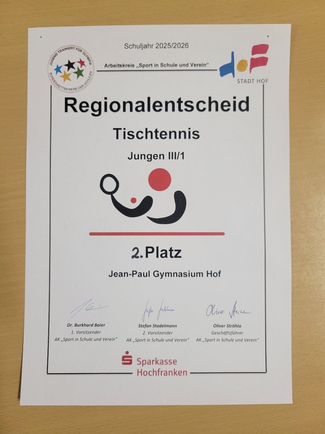 Am Montag den 24.11.2025 hatten 6 talentierte Jungen aus den Jahrgangsstufen 7 und 8 ihren großen Auftritt in der Turnhalle der Eichendorff-Schule in Hof. In der Wettkampfklasse III duellierte sich das Jean-Paul-Gymnasium und das Otto-Hahn-Gymnasium aus Marktredwitz. Einige Jungen spielen seit vielen Jahren aktiv im Verein und haben somit bereits wertvolle Ranglistenpunkte gesammelt. Entsprechend hoch waren die eigenen Erwartungen an den Turnierverlauf.